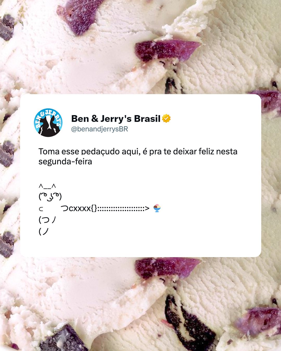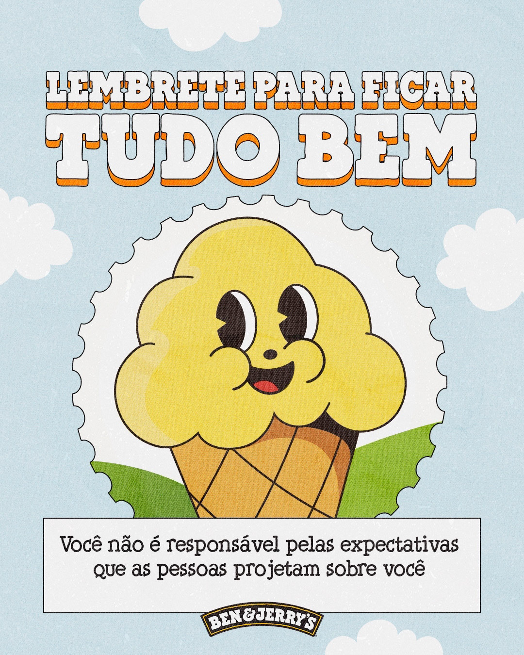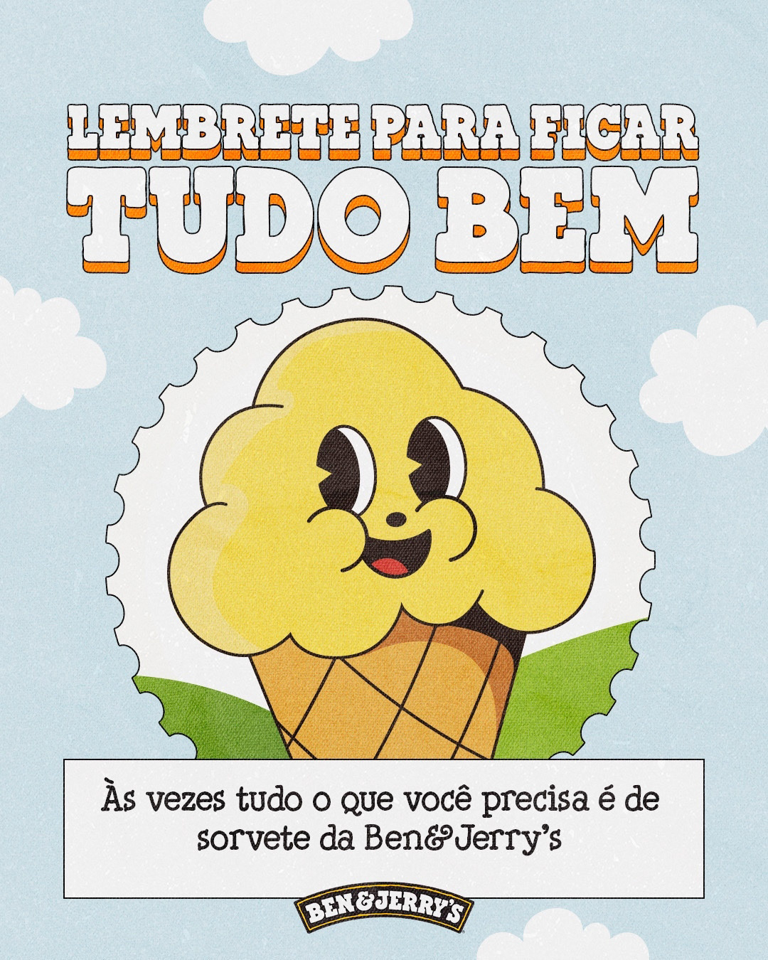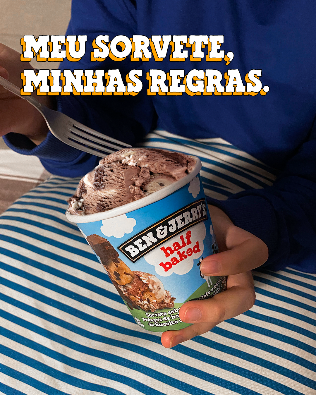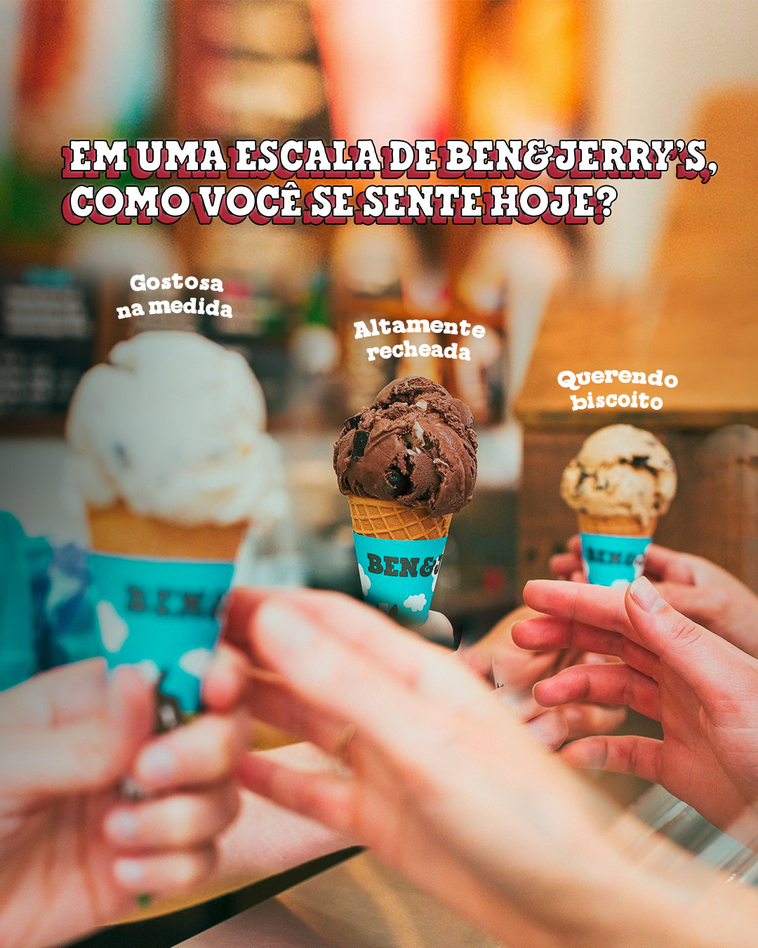 A Ben&Jerry's é uma marca de sorvetes global que pauta sua comunicação no senso de comunidade: engajando com pessoas que são apaixonadas por sorvetes mas que também prezam por responsabilidade social. É uma marca que não tem medo de se posicionar como antirracista, apoiadora dos direitos LGBTQIAP+ e que luta contra o machismo. Além de espelhar essa personalidade da marca nos conteúdos, buscamos também trazer peças com foco nos atributos dos sorvetes e jogos de interação com o público.