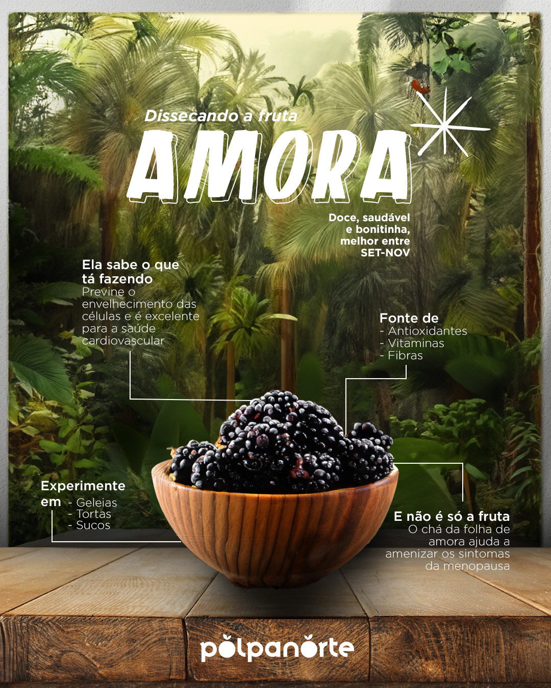 Here’s something you probably didn’t know: blackberries prevent cell aging and are excellent for heart health. #Polpanorte is health, flavor, and knowledge! You can find blackberries in pulp form or frozen, ready to enjoy anytime, even out of season 💜
