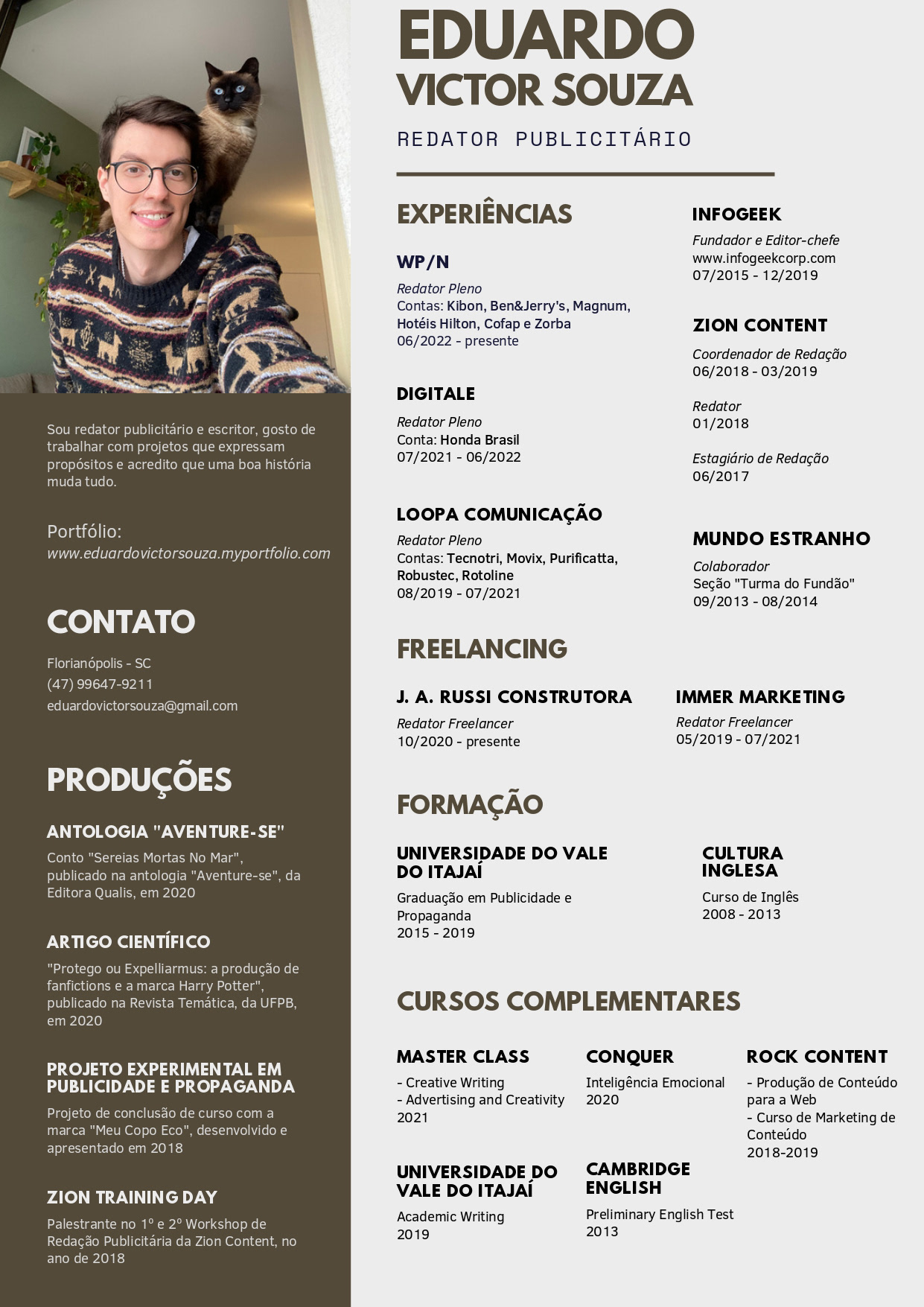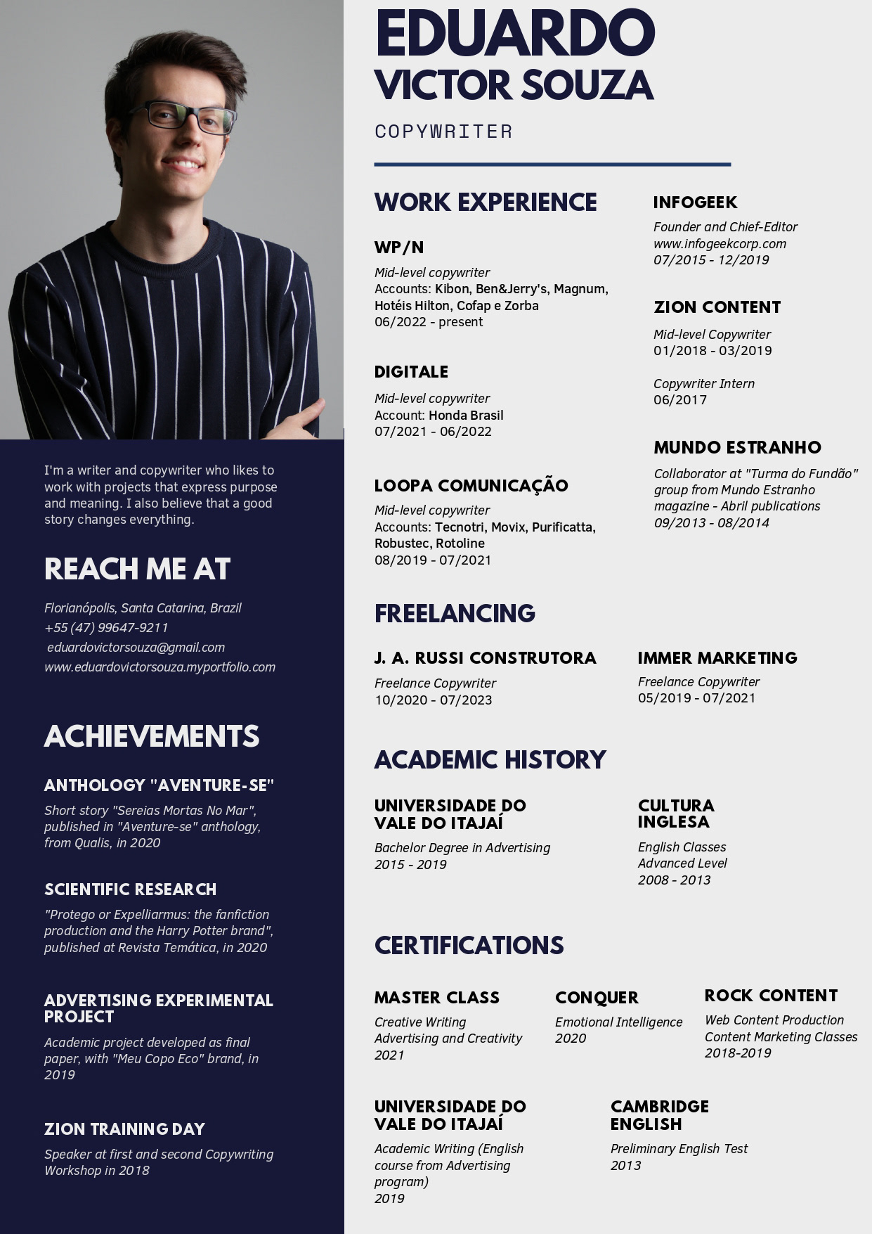 Aqui você encontrará o meu currículo (em português e inglês) com todas as minhas experiências e formações.