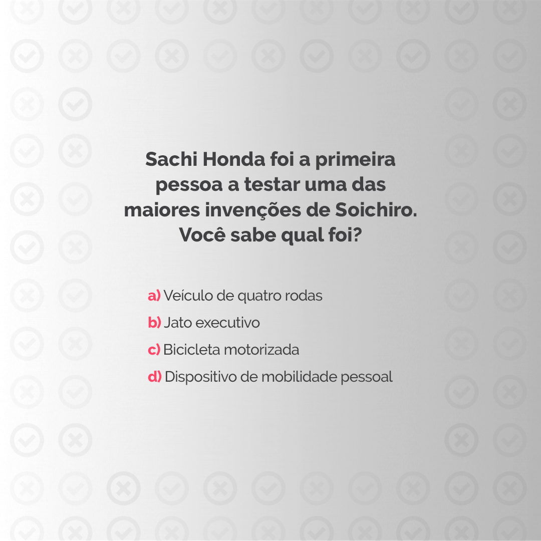 A resposta correta é a letra C! Sachi Honda foi a primeira pessoa a testar uma bicicleta motorizada criada por Soichiro. Você acertou? Conte pra gente nos comentários!