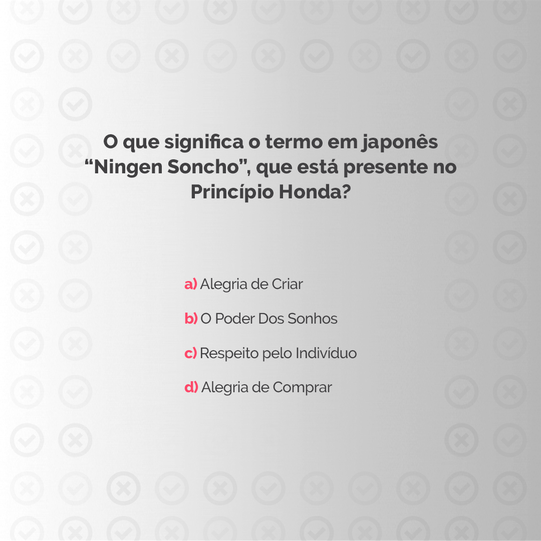 A resposta correta é a letra C - Respeito pelo Indivíduo. Literalmente, “Soncho” significa “respeito” e “Ningen” significa “ser humano”. Ou seja, o “Respeito pelo Indivíduo”. Você acertou? Conte pra gente nos comentários!COPY: