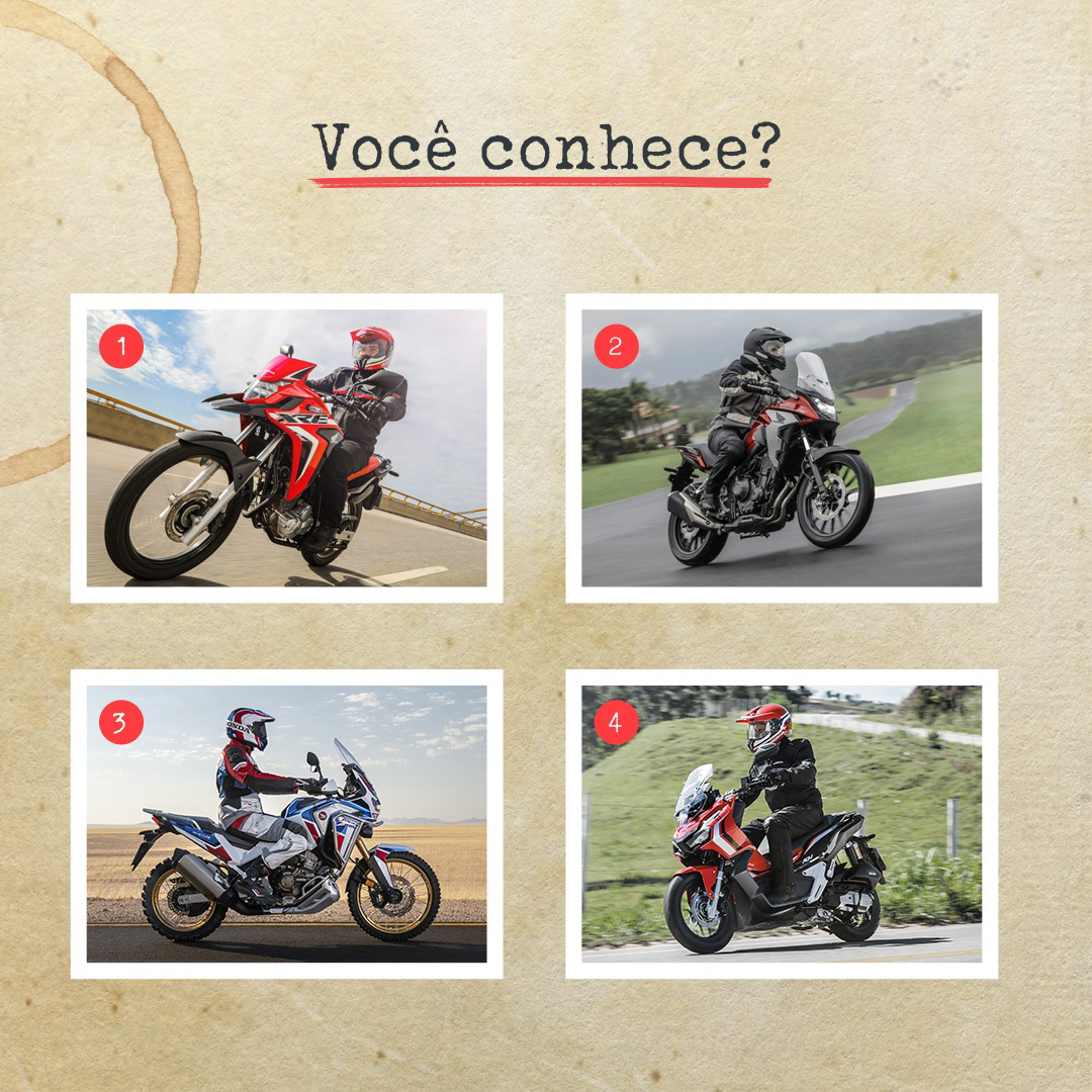 Você sabe o nome desses quatro modelos da imagem? Dica: elas pertencem às subcategorias Trail, Crossover, Big Trail e Scooter, respectivamente. Deixe seu palpite nos comentários. Amanhã traremos a resposta correta.
