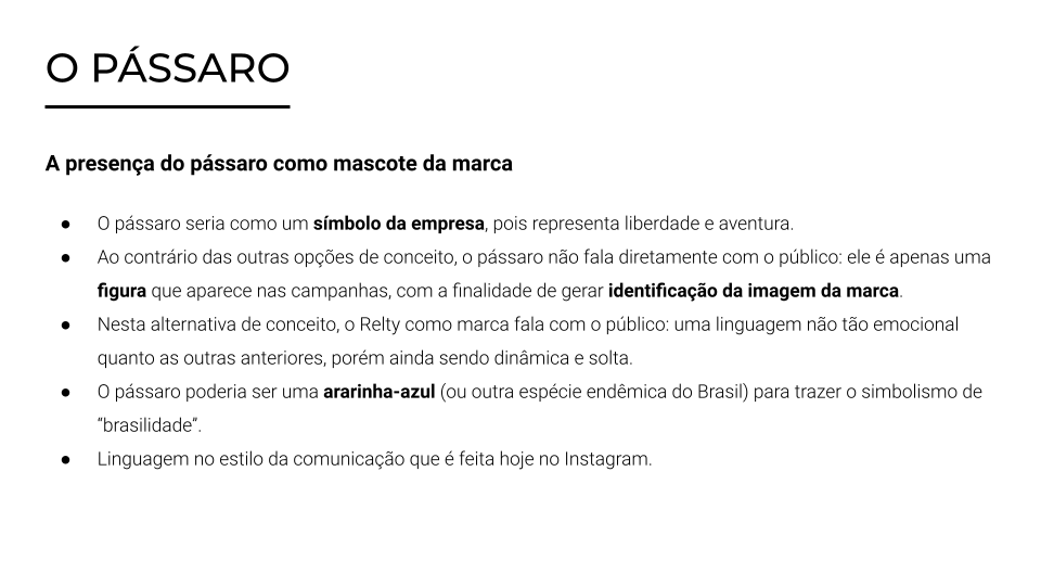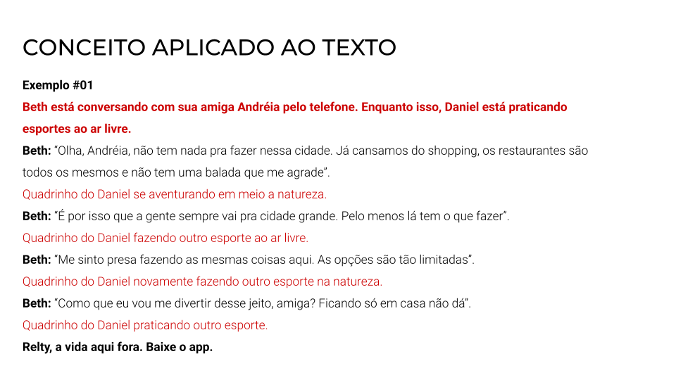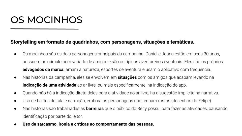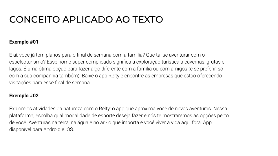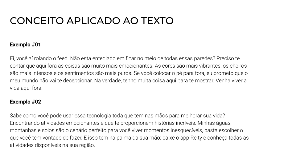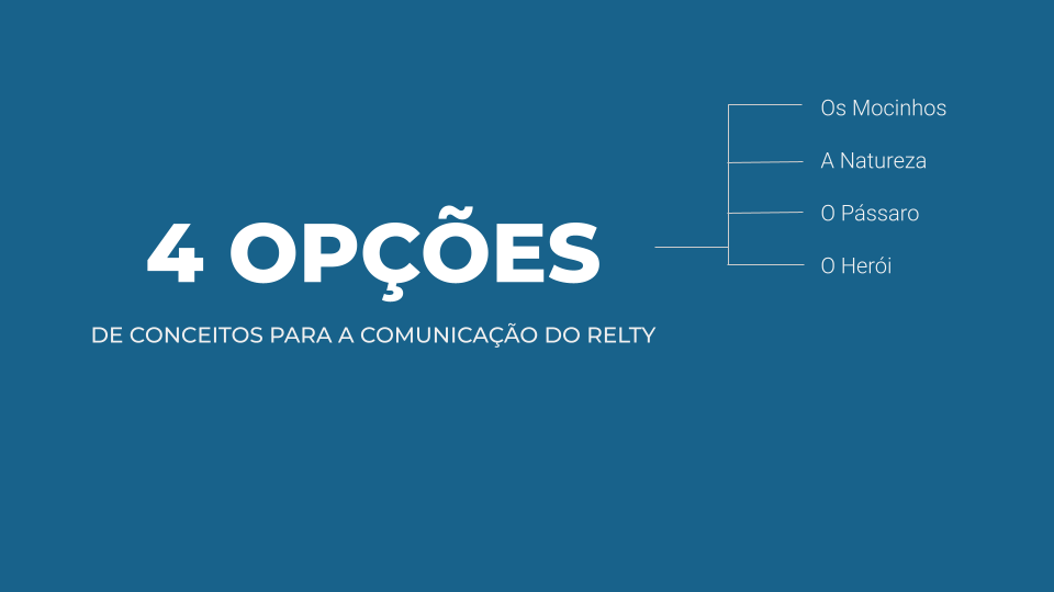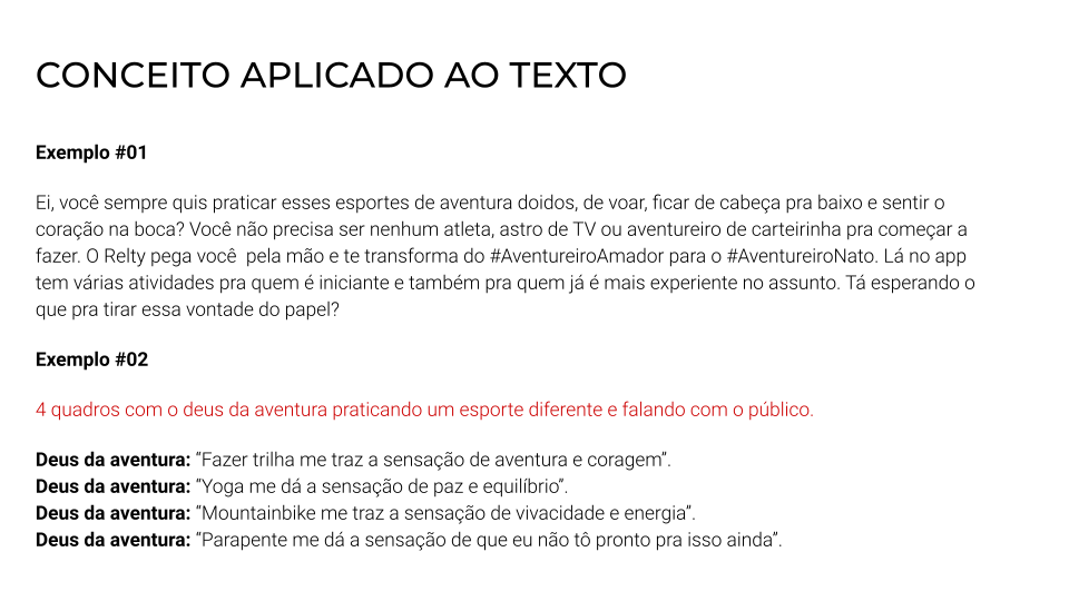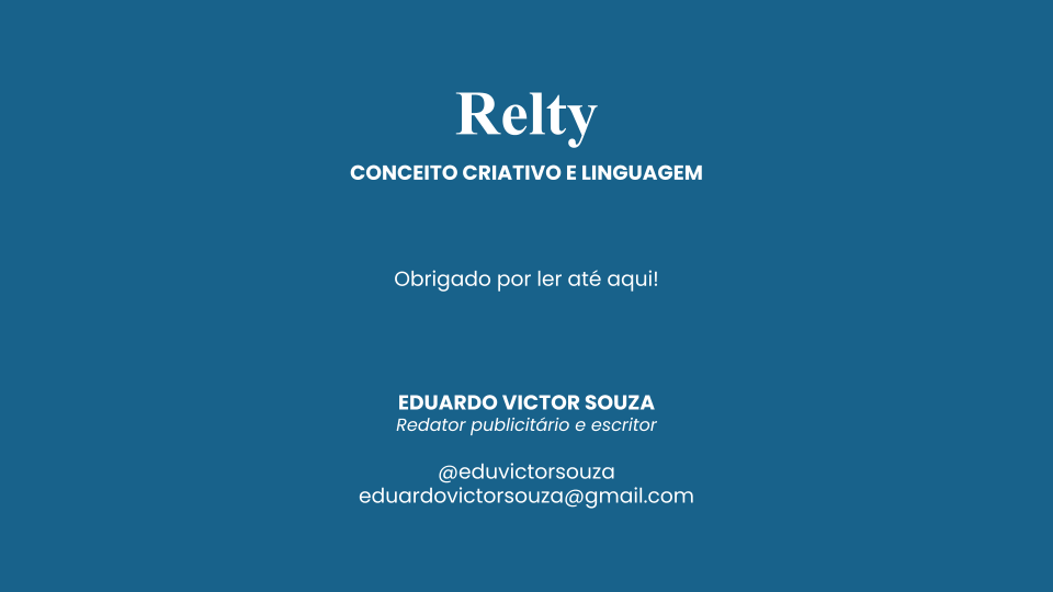 O Relty é um aplicativo que conecta pessoas a aventuras, oferecendo atividades ao ar livre e que incluem modalidades na terra, água e ar. Em 2020, fui convidado para criar o conceito criativo e o manual de linguagem da marca. O principal propósito do Relty é fazer as pessoas saírem de casa, buscando um sentimento de escapismo e retorno à infância, onde existia uma vida sem amarras e compromissos. Para este projeto, desenvolvi 4 vertentes de conceitos com aplicações em peças para o Instagram, canal principal da marca.
