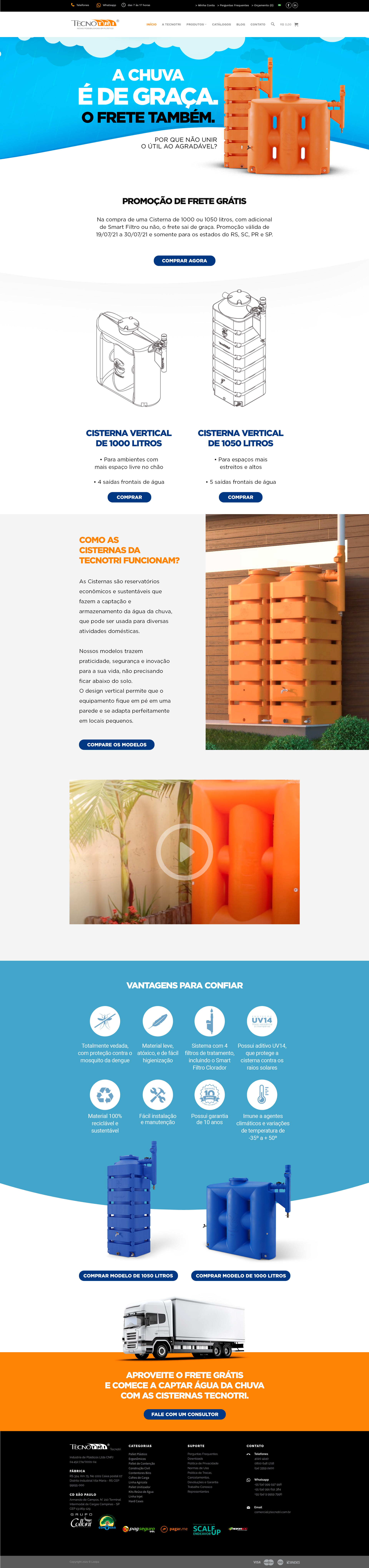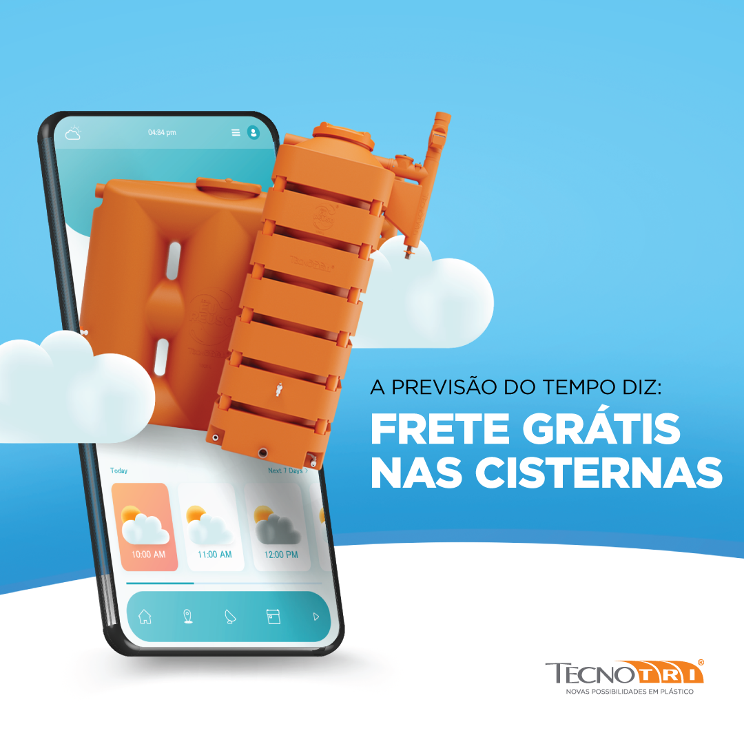 Não deixe de aproveitar a chuva de frete grátis! Ao comprar uma Cisterna de 1000 ou 1050 litros, você ganha o frete totalmente grátis. Os modelos da Tecnotri são verticais e modulares, não precisando ficar abaixo do solo. O design vertical permite que o equipamento fique em pé em uma parede e se adapta perfeitamente em locais pequenos. E, se você preferir, pode conectar uma Cisterna à outra. Aproveite o frete grátis e comece a captar água da chuva!