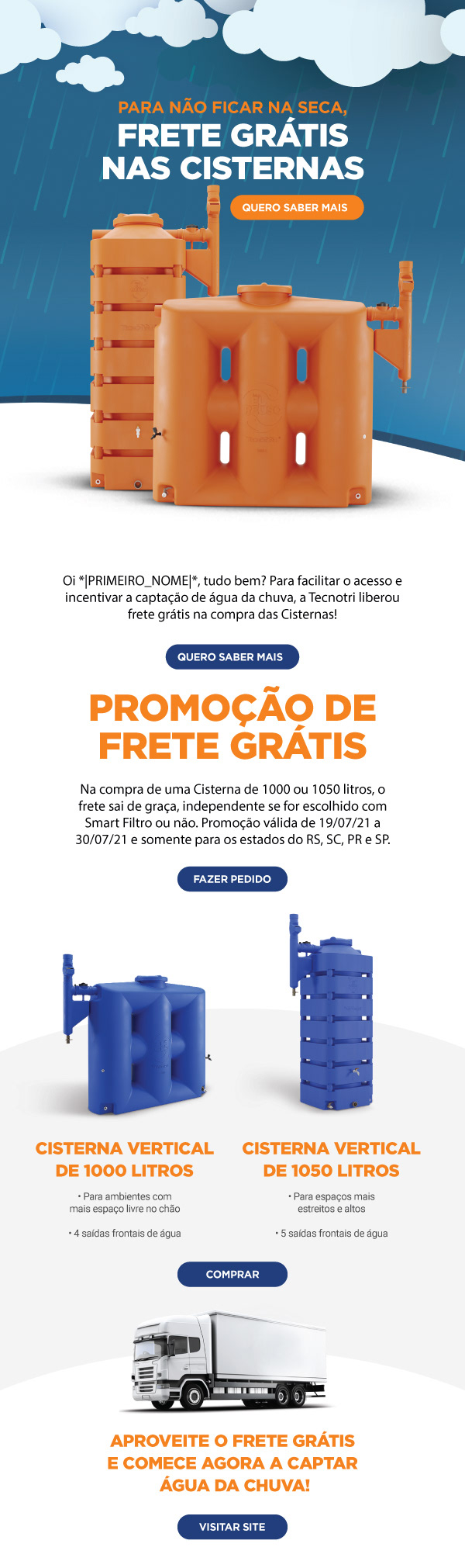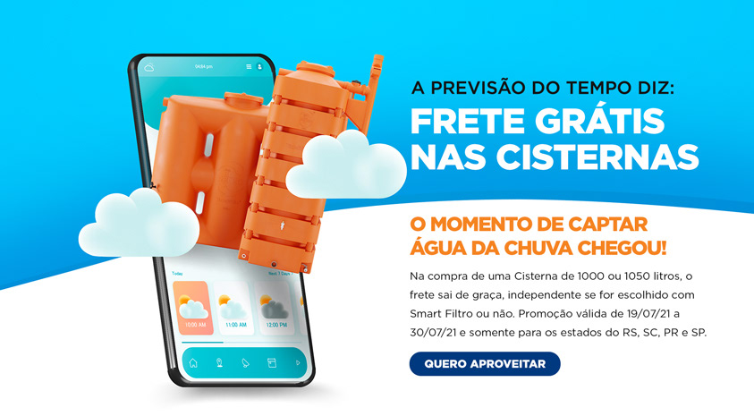 As Cisternas são reservatórios econômicos e sustentáveis que fazem a captação e armazenamento da água da chuva, que pode ser usada para diversas atividades domésticas. Nossos modelos trazem praticidade, segurança e inovação para a sua vida, não precisando ficar abaixo do solo. E o melhor: as Cisternas de 1000 e 1050 litros estão com o frete grátis! Aproveite a promoção para trazer mais sustentabilidade até a sua casa. Promoção válida de 19/07/21 a 30/07/21 e somente para os estados do RS, SC, PR e SP.