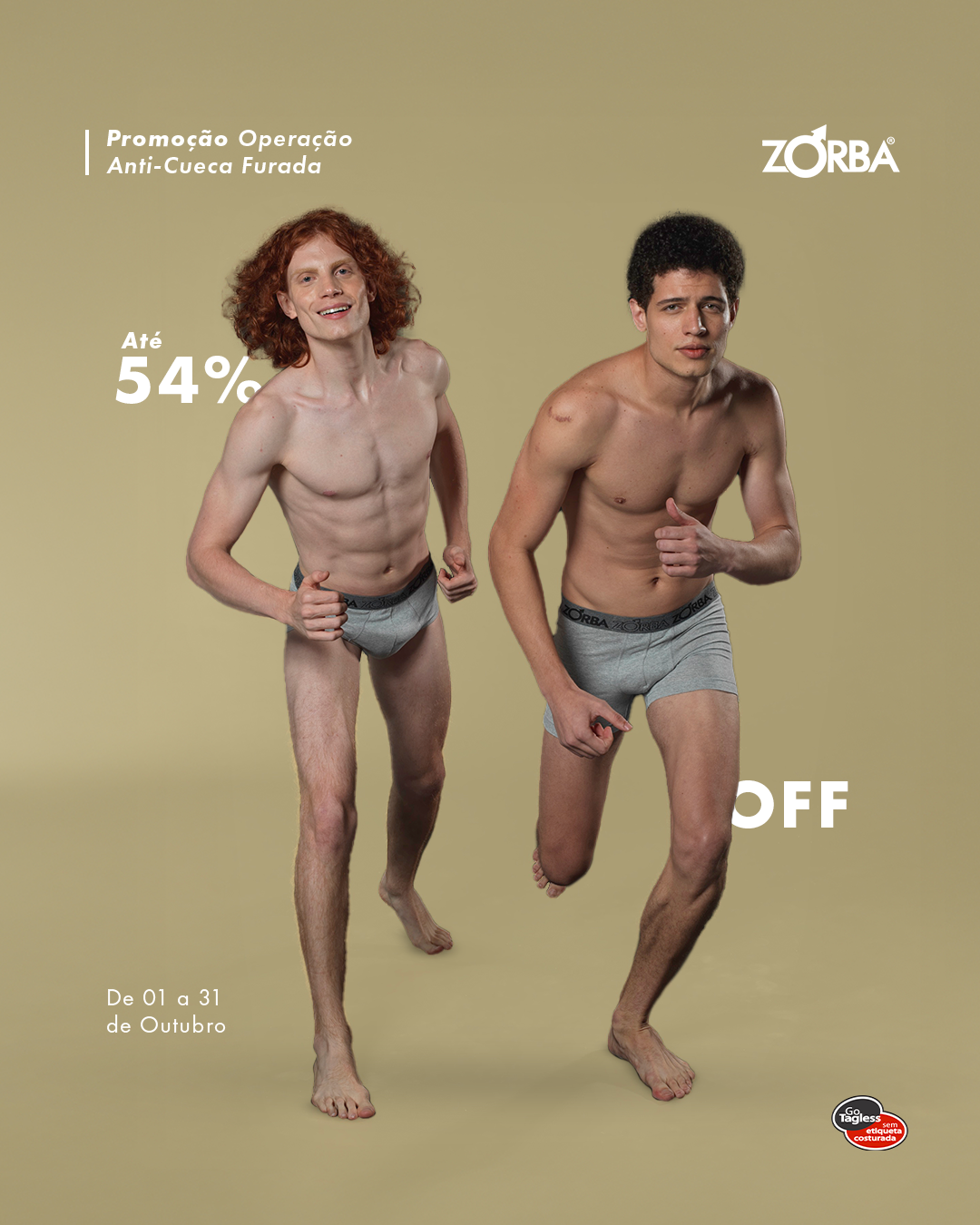 A missão é clara: substituir todas as cuecas furadas 😎 Corra para o site da Zorba e garanta até 54% OFF em cuecas. Promoção válida durante o mês de Outubro inteiro.